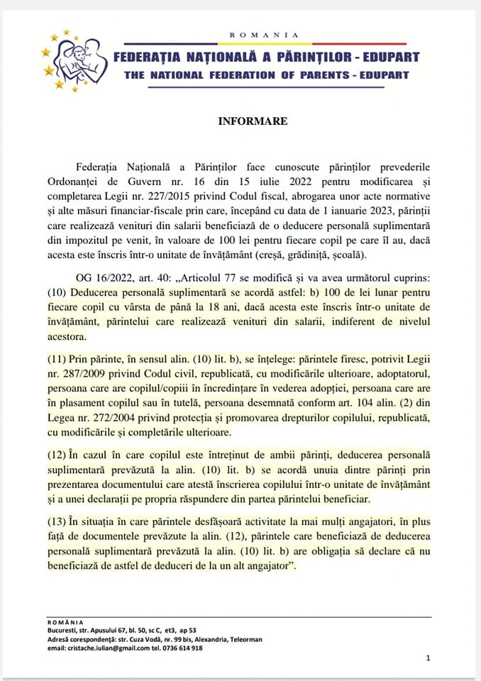 Se dau 100 lei în plus la salariu pentru părinții cu copii. Ordonanța de Urgență nr. 16 din 15 iulie 2022 stabilește că deducerea personală suplimentară se acordă părinților care au salarii, indiferent de nivelul acestora. Copilul trebuie să fie înscris într-o unitate de învățământ.